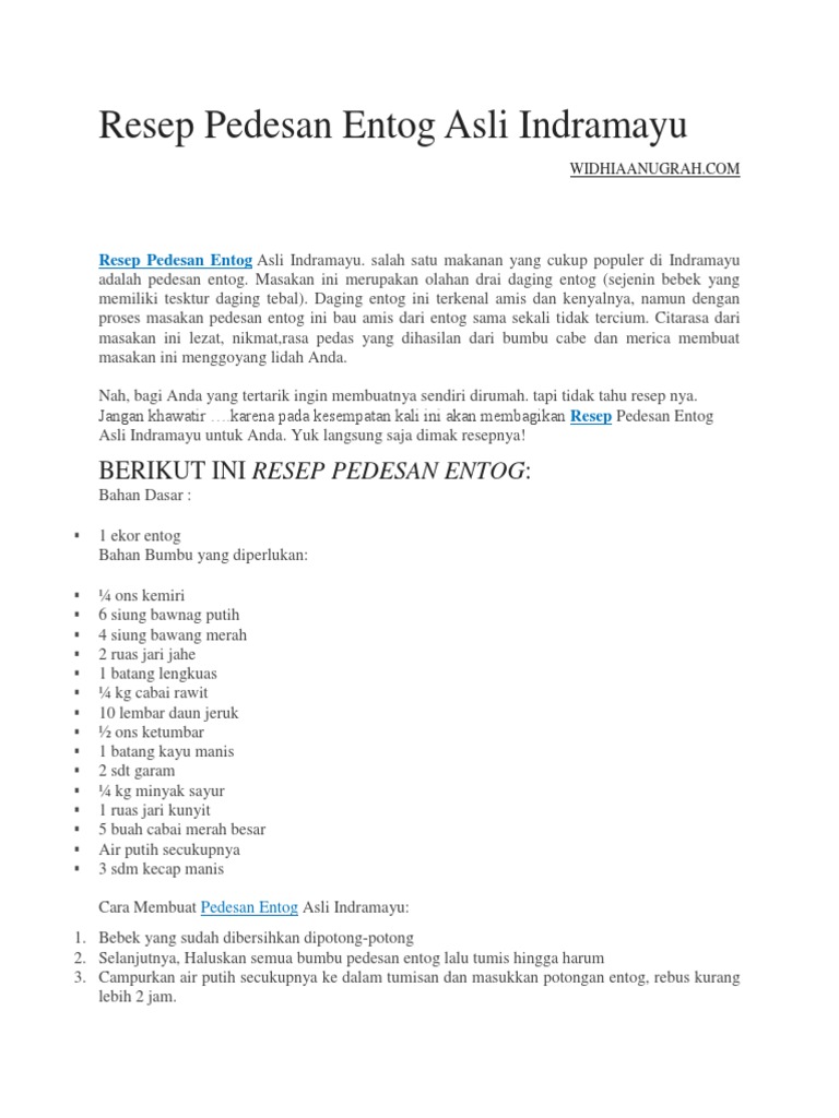 Gudangnya resep masakan / resep makanan nusantara. Selesai juga resep pedesan entog yang lezat dan nikmat ini. Masak hingga bumbu meresap wangi dan ayam empuk. Resep ayam geprek dengan berbagai varian bumbunya memang banyak dicari, karena sekarang menu masakan ayam geprek ini memang sedang populer, apalagi. Pedesan ayam khas indramayu pedas.